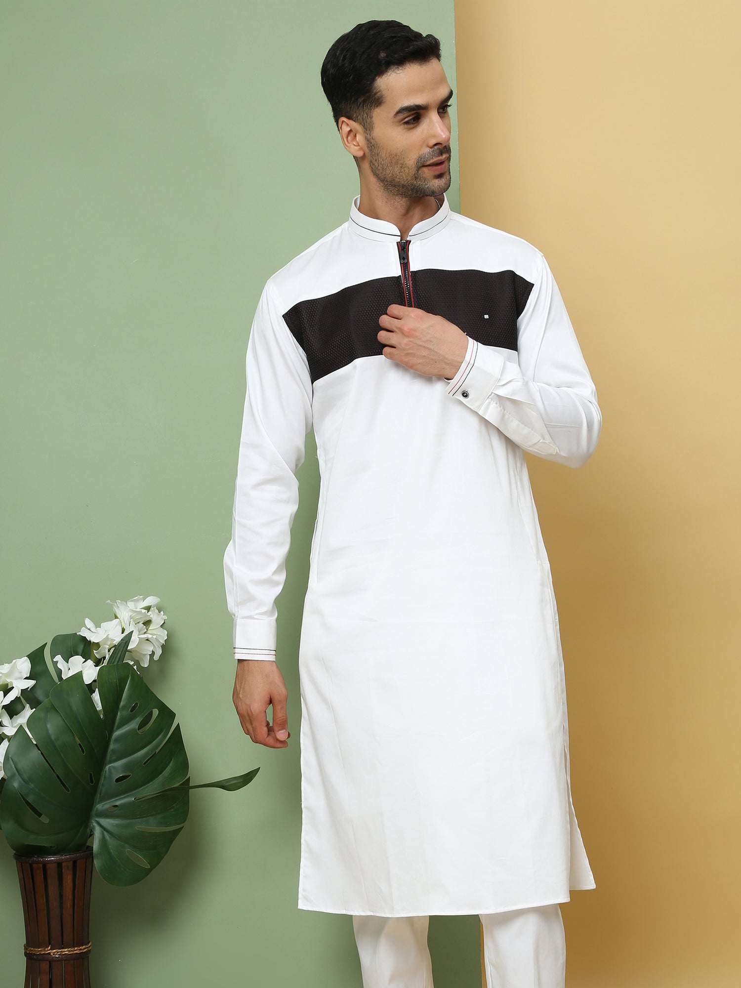 WHITE & BLACK PATTERNED PATHANI KURTA SET