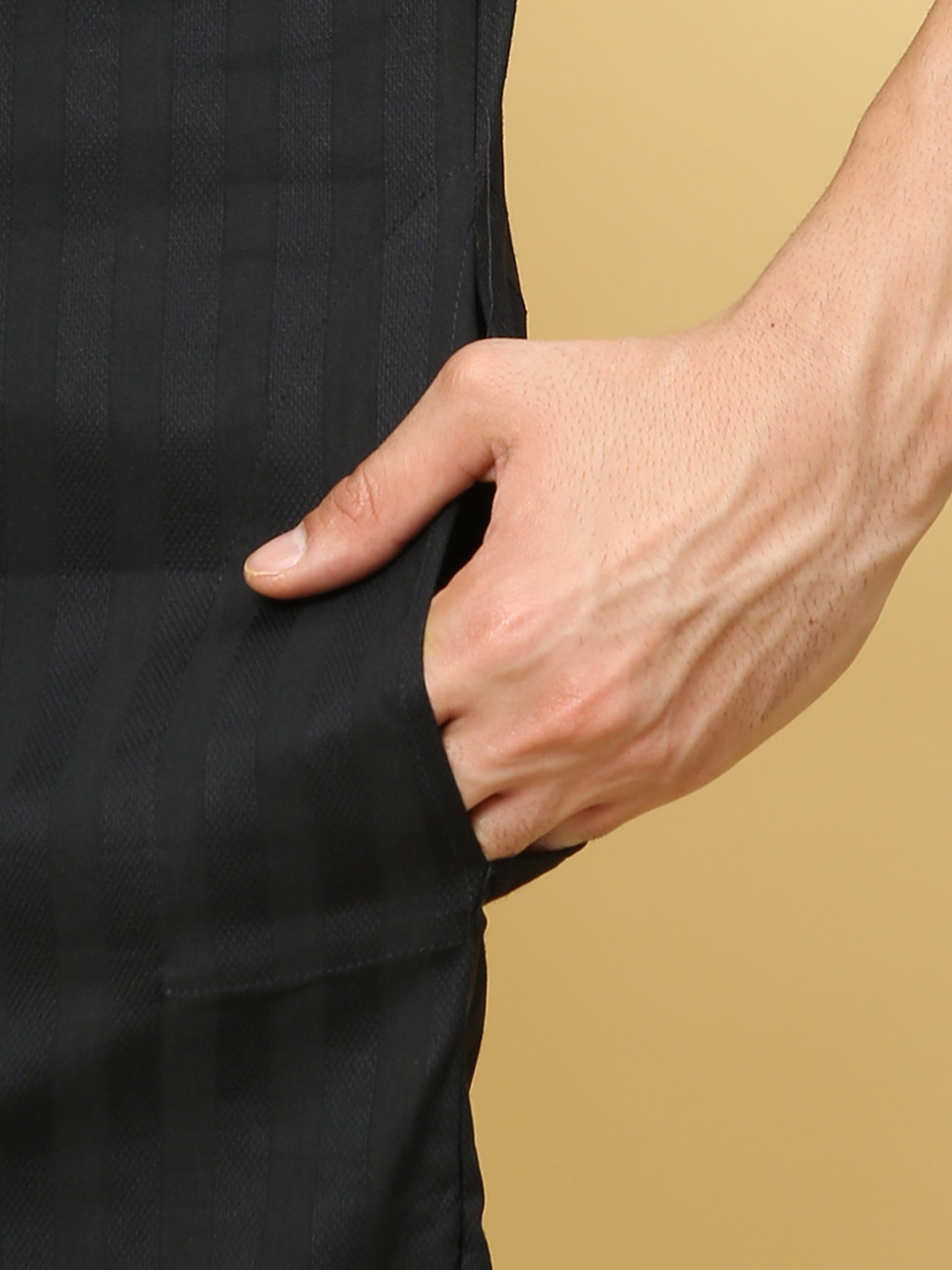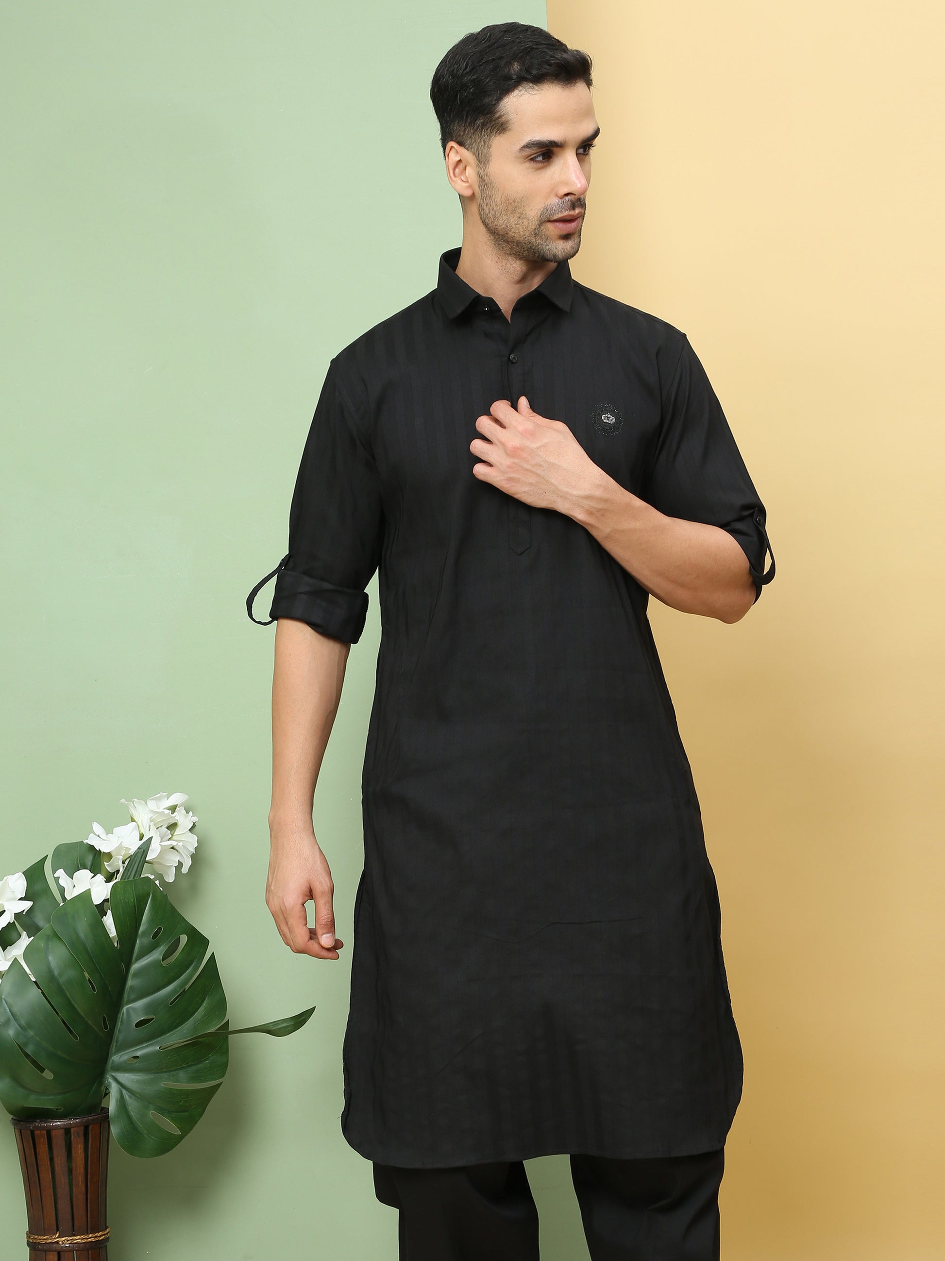 This black pathani kurta set is a terrific traditional evergreen style to include in any wardrobe. It features a unique silhouette with a Spread Collar. The Kurta has a comfortable fit, regular sleeves and is made of Imported Japanese polinosic fabric.
